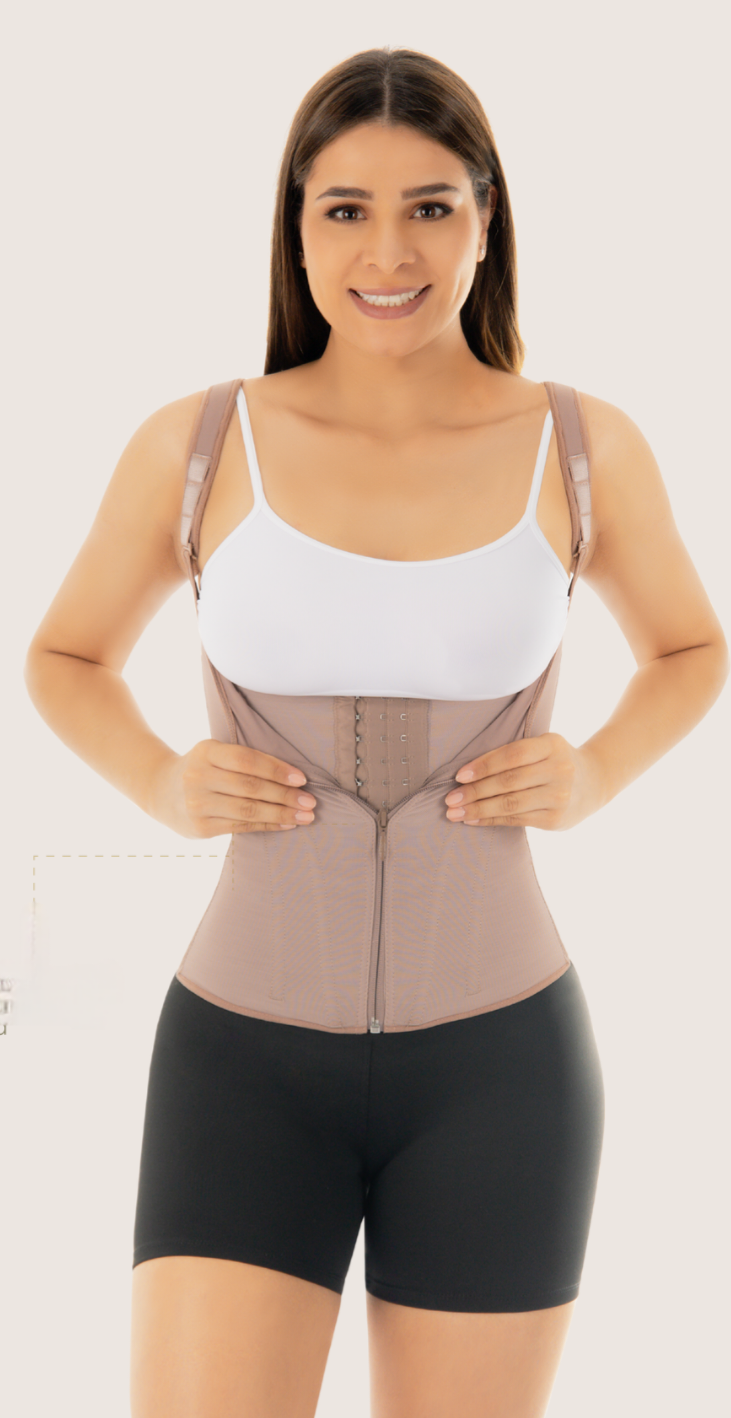 100% Colombian, made of powernet fabric, high compression, 4 lines of hooks and frontal zipper, covered back, adjustable straps, abdomen and waist control.